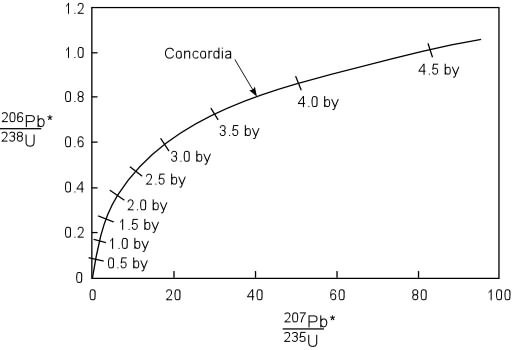To check whether a sample of igneous rock falls on the concordia curve, a geologist first needs to determine (206Pb/204Pb)o. If molten lava flows through a lead mining site which does not contain any uranium impurity, the ratio of (206Pb/204Pb)o would be approximately 17. If lava flows through a uranium mining site containing no primordial lead, this ratio would be infinite since uranium does not decay to 204Pb. And when this magma solidifies, whatever radiogenic lead produced while the magma flowed would be preserved in the rock.