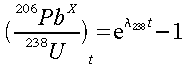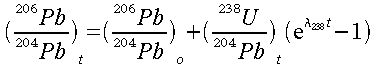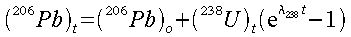 The amount of 206Pb present in a rock (206Pbt) is the amount of 206Pb present during solidification (206Pbo) plus the amount of 238U present initially during solidification (238Uo) which decayed subsequently to 206Pb. Let l238 denote the decay constant of 238U. 238Ut denotes the amount of 238U present today.